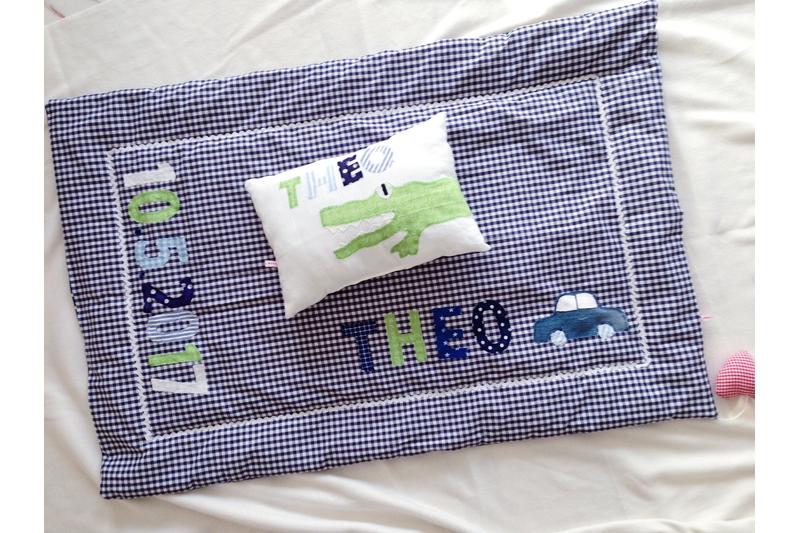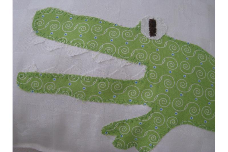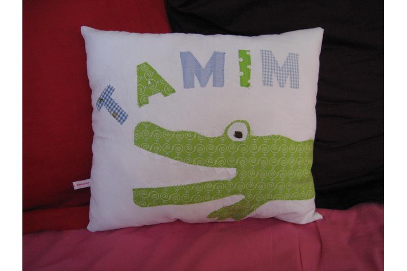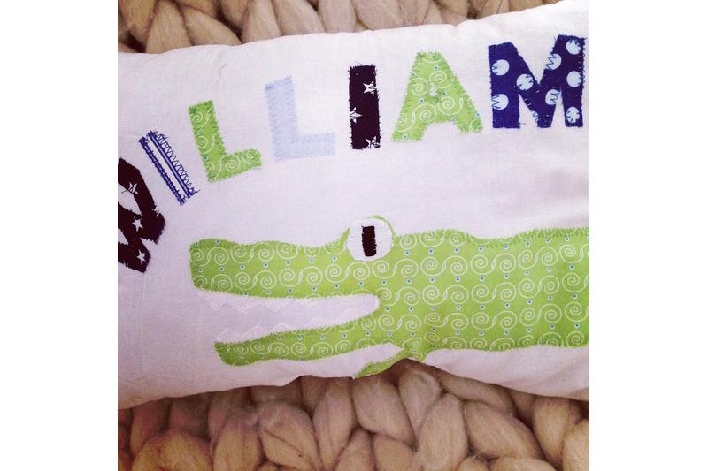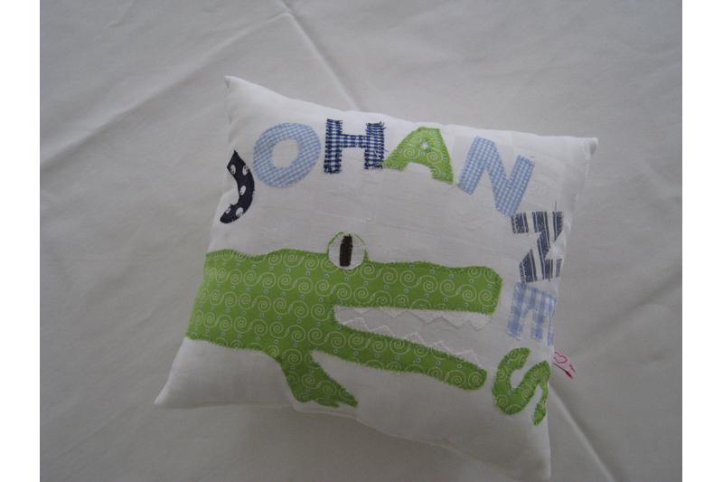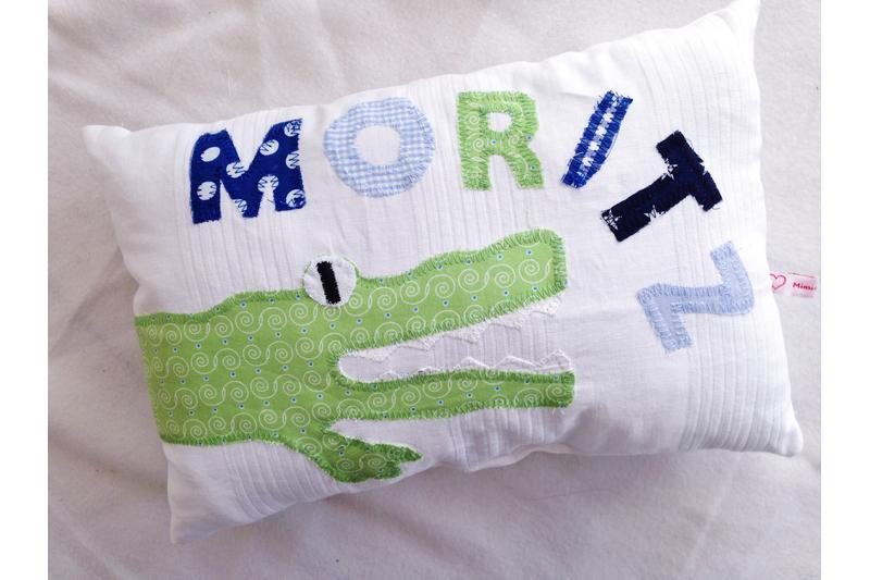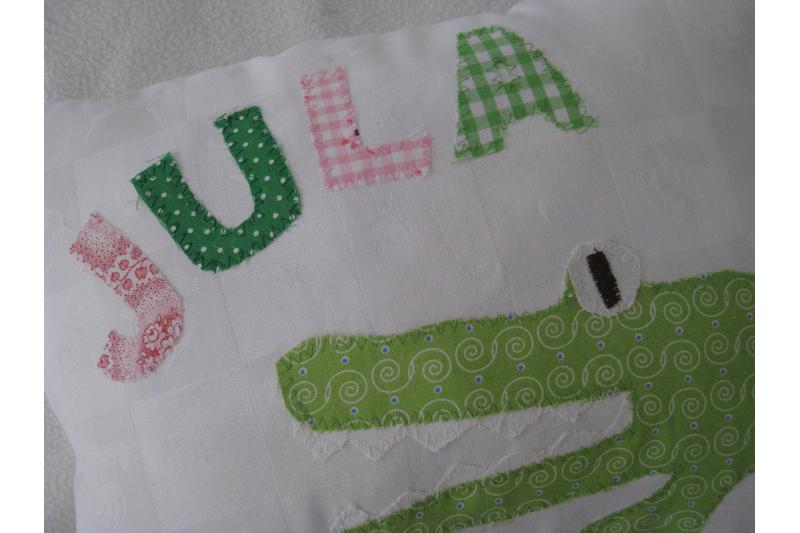 Ausführung: Das Kissen ist aus weißem Baumwollwebstoff gefertigt. Ein grünes Krokodil mit aufgesperrtem Maul wird so platziert, dass es um das Kissen herumläuft. Der Kopf ist auf der Vorderseite, der Krokodilpopo auf der Rückseite. Oberhalb des Kopfes wird der Name mit einzelnen Buchstaben aufgenäht. Für Jungennamen wähle ich dazu Blau- und Grüntöne. Für Mädchennamen kombiniere ich grüne mit rosa- oder pinkfarbenen Stoffbuchstaben.
